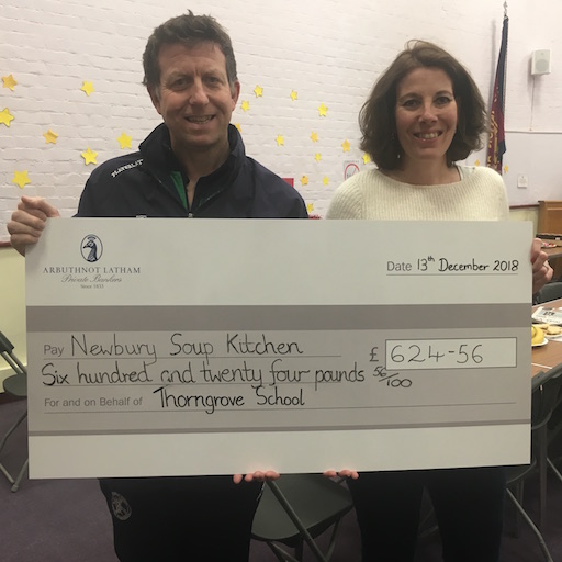 Adam King the Headmaster from Thorngrove School came in to see us with a cheque. They gave us money last year and supported us with purchasing a commercial freezer. He said they will support us next year too. The school held a Carol Concert and all the money came from that. We want to say thank you for their ongoing support.