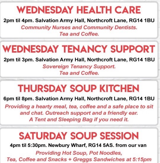 Therefore Pot Noodles and tinned food such as baked beans, tuna, rice and pasta are needed more than ever. We will be looking for simple meals that we can give out and people can take away with them rather than sitting down in a room socialising in an enclosed busy space. We have been made aware that Pot Noodles are 50p in Poundland at present. They can be dropped off at the Salvation Army Hall Wednesday 2-4pm or Thursdays 4-5.30pm. There are donation points at Co-Op Brummell Rd and Wash Common and Harpers Garage Hungerford