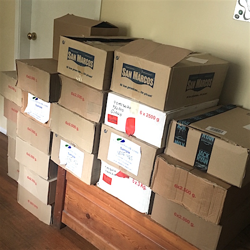 A week ago we were donated lots of 2.5KG catering size tins of kidney beans, white beans, black beans, butter beans, cherry tomatoes, jalapeño peppers and chipotle peppers. Each box has 6 tins each we have 21 boxes in all.