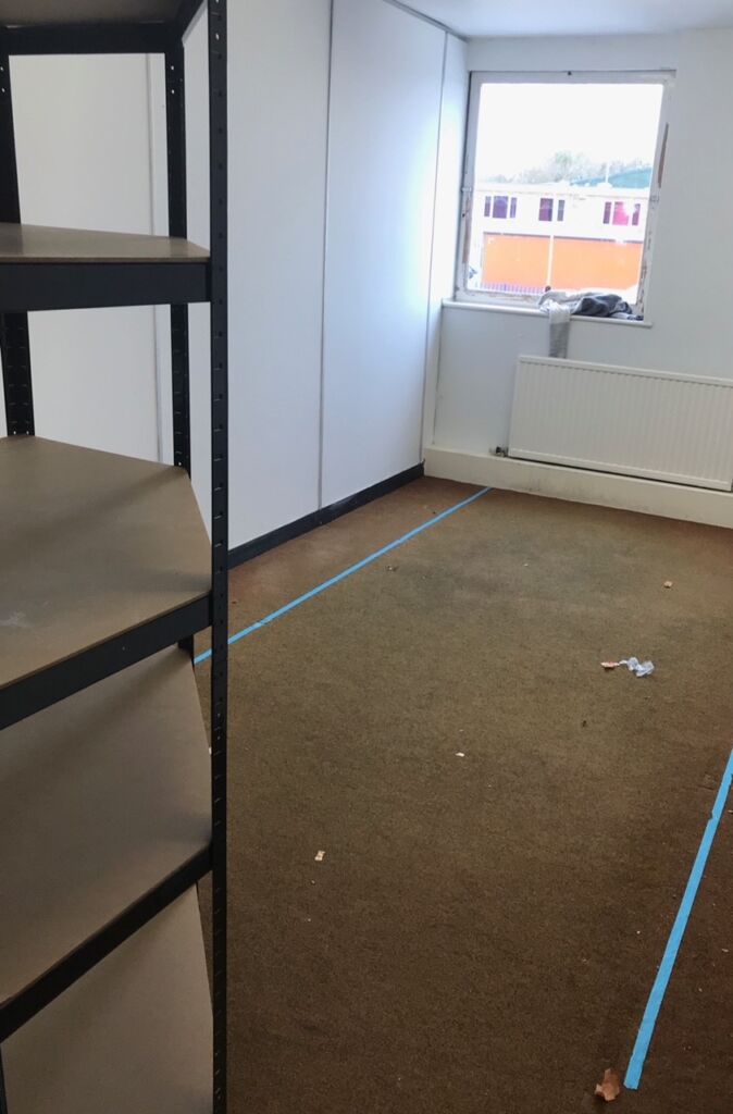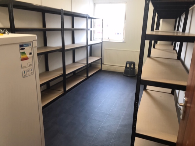 A wonderful inspector from Food Standard Agency came to do a pre installation inspection for us as we wanted to make sure everything, we were doing was according to Food Standard regulations. The kitchen when completed will have to registered and inspected to gain a rating. This is up to 5, We are used to this has we have had the kitchen inspected on our behalf before at the Salvation Army, in that instance we gain the top rating. It is important for us to do that again. One issue he did pick up though which we hadn’t even thought of was that the floor in our ambient storeroom needs to have a Lino on the floor. Mai-Britt emptied the room the next morning and the link was installed the day after. It looks so much better and more practical than we had.
