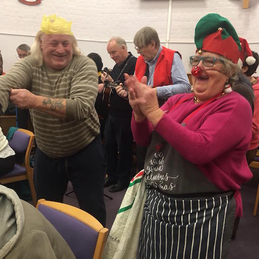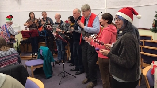 The Ukulele band NUTS came again to play. They were wonderful, the atmosphere came alive. People danced and sang. Debbie, one of our volunteers got roped in to stand and shake bells too.