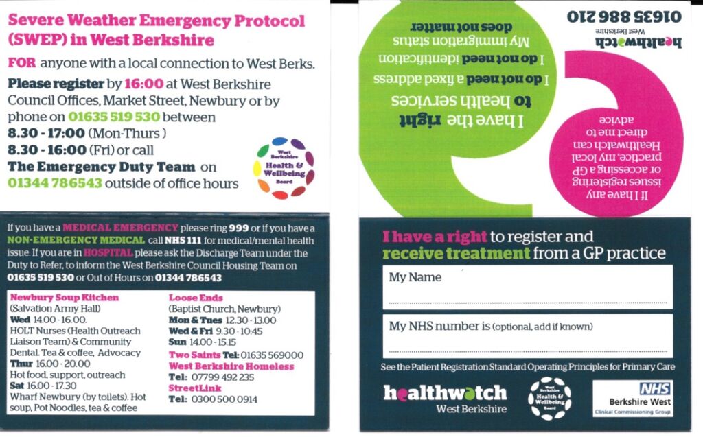 Healthwatch West Berkshire have put together the cards below that can be given out to rough sleepers and homeless individuals. They provide information on charities and organisations that people who find themselves on the streets can access. These cards will also help a homeless individual get access to medical care and register with a GP practice without a fixed address.