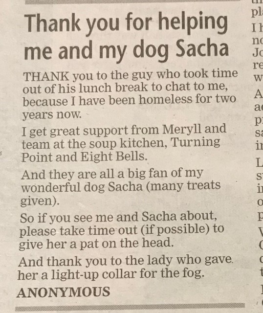 Drug addicts, alcoholics and people with mental health issues are kind, generous and very keen to say thank you, showing compassion and concern towards each other or our volunteers. When people have nothing, they still find time to show expressions of kindness. Putting each other up to give someone respite from sleeping in a tent when the weather is very cold or wet. Inviting a person who is rough sleeping a shower or a meal. Keeping an eye out that someone is safe. This Community stick together and care for each other as best as they can.