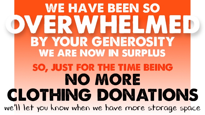 We are so overwhelmed by people’s generosity and thought at this time of year which can be so difficult for some. As a result we have no space available for clothes donations so they can be given to Loose Ends or charity now as are space is bulging. Now we have storage offered by Greenham Trust which is so kind.